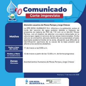 Con el objetivo de garantizar el abastecimiento continuo y oportuno de agua potable, la EPS SEDA Huánuco S.A. continúa fortaleciendo su capacidad operativa en beneficio de la población. En el marco de la política de mejora y optimización del servicio, el gerente general, Ing. Mirko Jurado Dueñas, realizó la entrega oficial de un camión cisterna con capacidad de 2,500 galones (9,463.53 litros), destinado al traslado y distribución de agua potable, reforzando así la atención ante posibles emergencias y contingencias del servicio.